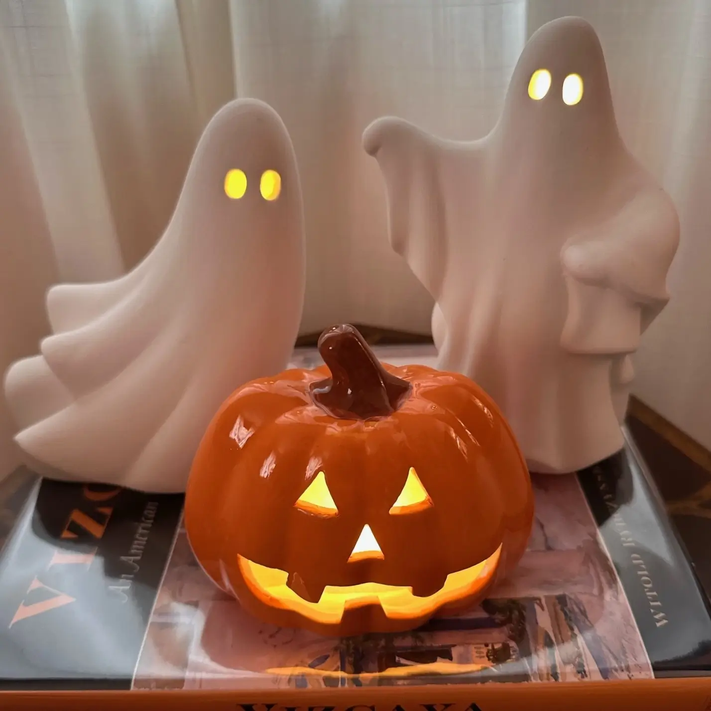Ceramic Halloween Ghosts and Jack-o'-lantern luminaries. Tasteful Halloween Decor vignette