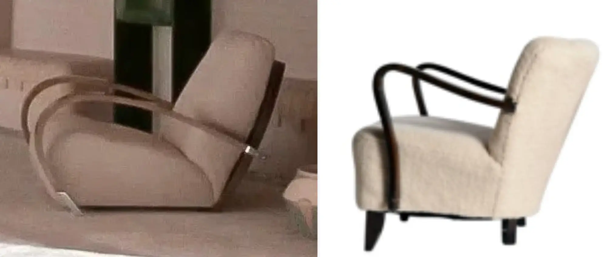 The furniture features shades of cream or cognac with wood in blond or medium tones. The foyer features an arched, recessed bookshelf full of green encyclopedias (?). A fabulous lounge chair sits adjacently creating a sort of reading nook. I can’t quite place the chair, but the sleek design is typical of many of the higher-style Art Deco armchairs.
