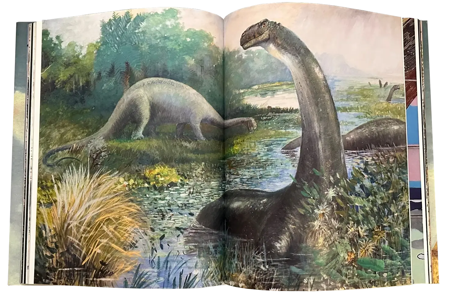 I have opened the book here to a spread that features the artwork of Charles Robert Knight, considered one of the greatest paleo artists of all time. The image is rather interesting because it depicts an animal that people my age have long been told did not exist but that older generations were well-acquainted with: the Brontosaurus. For a long time, it was believed that these animals actually belonged to the genus Apatosaurus. In 2015, a new group of researchers proposed that the genus Brontosaurus was in fact valid after all. The artwork is of course beautiful and evocative of a time before humans existed, but it also presents an interesting way to have a conversation with house guests about how science operates and how our understanding of a subject can change over time even it has been well-studied for over a century!