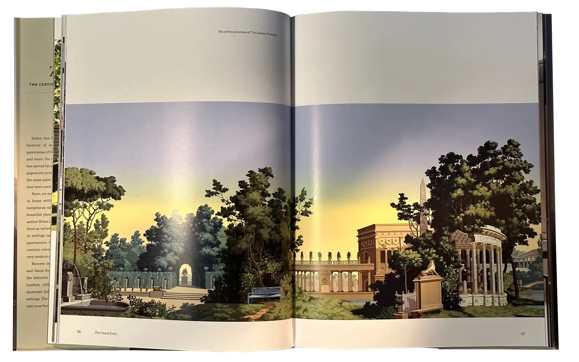 Below, I have opened up the book to a two-page spread featuring one of Zuber’s panoramas. If I were to set this on a coffee table or side table for my guests to see, I might explain to them that Zuber wallpapers come in a variety of prints, all featuring beautiful scenes, and these wallpapers only developed as a result of advanced paper-making technology in the late 18th and early 19th centuries. These wallpapers provide a stately atmosphere to a room, and a Zuber scene even hangs in the Diplomatic Reception Room at the White House!