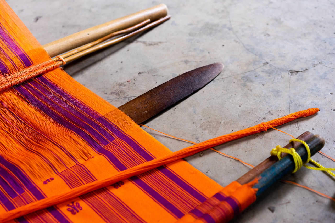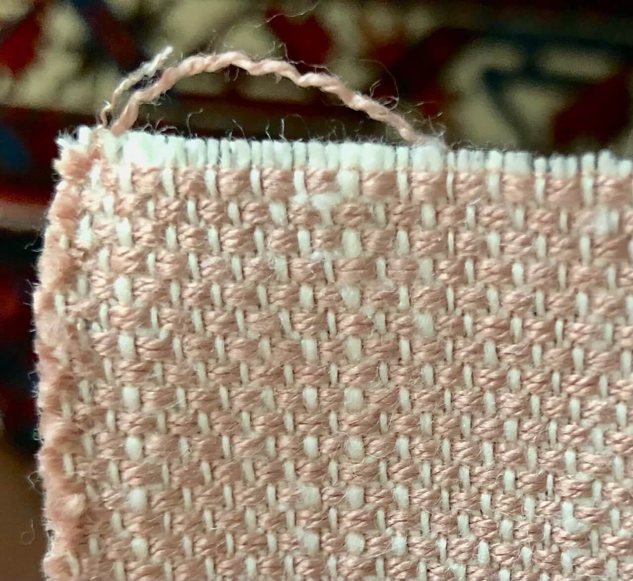 This woven fabric shows the warp yarns, in white, and the weft yarns in pink.