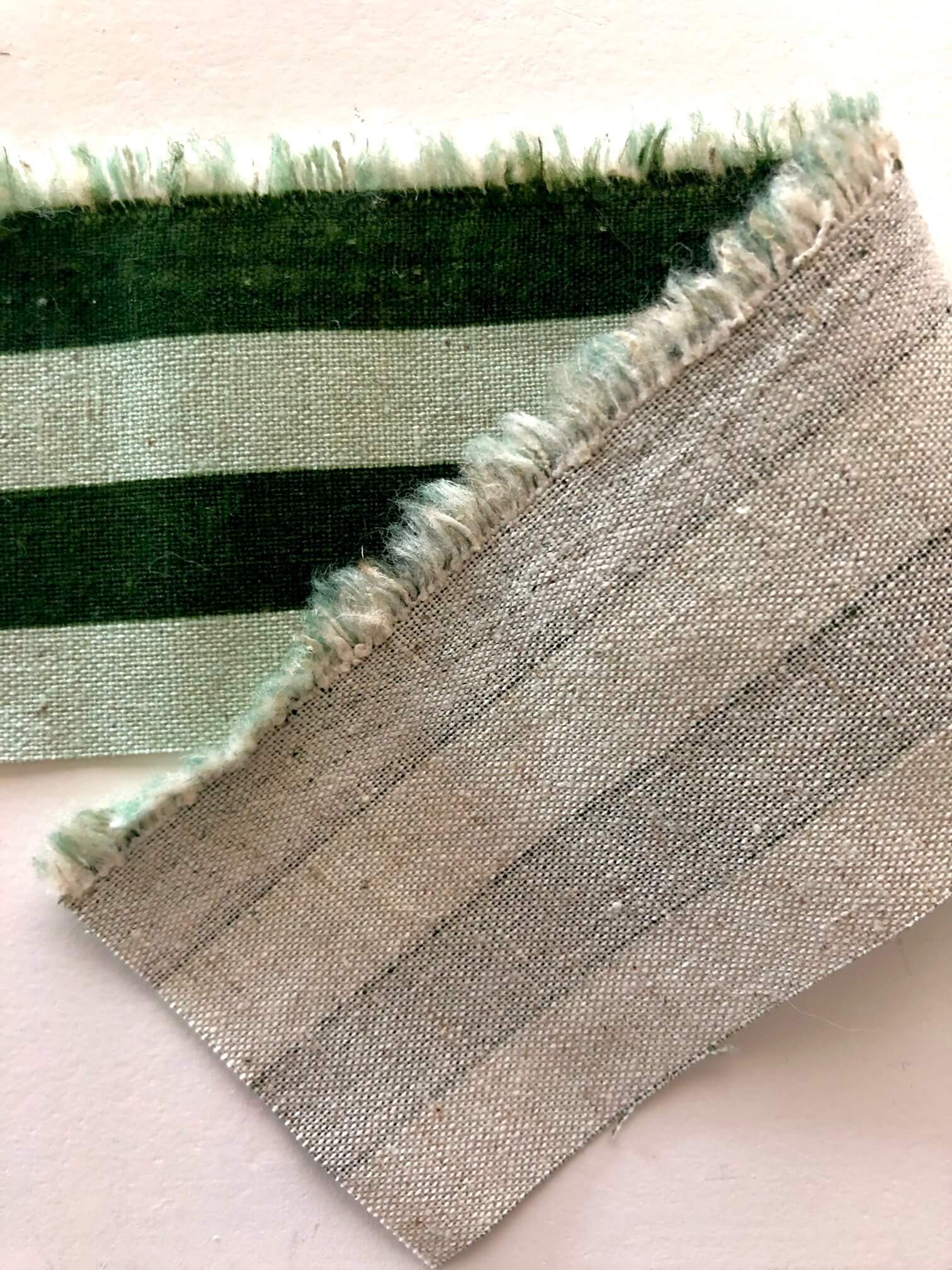 This woven fabric shows the face, with a printed green stripe pattern, and the back.