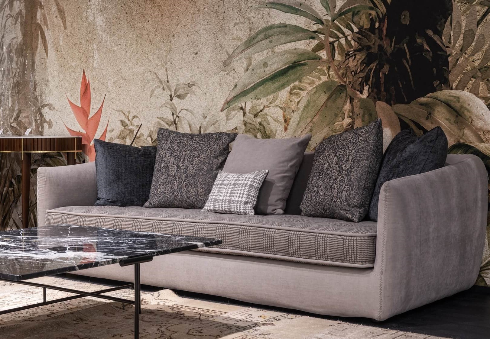 This sofa is upholstered in two different woven fabrics to provide texture and visual interest. The cushions similarly are covered in various woven fabrics.