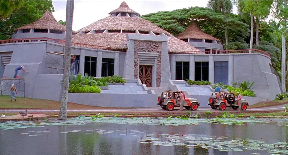 This short blog post series will primarily focus on the interiors of the Jurassic Park Visitor Center. However, I want to use this first post to acknowledge the remarkable design of the building’s exterior. Far from a mere backdrop, the Visitor Center embodies the grandeur and ambition of John Hammond’s dream, assuming the role of an essential character. The awe-inspiring façade leaves a lasting mark on viewers, immersing us in the captivating world of Isla Nublar.