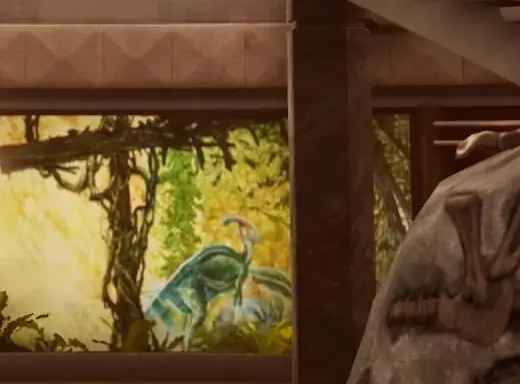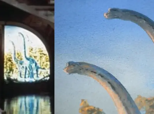 Artist Douglas Henderson created the murals, showcasing dinosaur species as they appear in “real life” at Jurassic Park. Many people overlook the two smaller murals alongside the central mural with Velociraptor and Parasaurolophus: one featuring Gallimimus and the other showcasing Brachiosaurus.