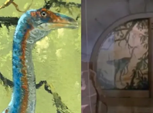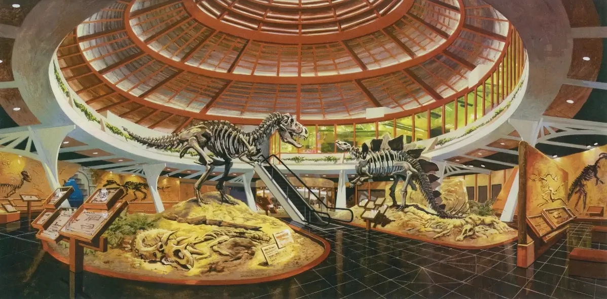 The mural aims to evoke the era “When Dinosaurs Ruled the Earth,” as emphasized by a prominent banner hanging over the rotunda. However, it’s important to note that in reality, none of the depicted species historically coexisted or inhabited the same location, except at Jurassic Park.