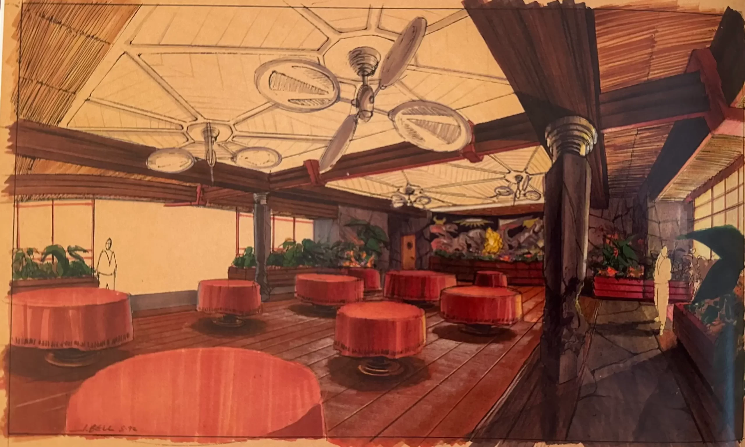An early concept for this space by artist John Bell shows a long, low-ceilinged room with wooden beams, rock work, and interior planters filled with exotic plants. Large tropical ceiling fans hang overhead. This concept appears to be inspired by Hawaiian interior design of the 1940s and ’50s. It reminds me a bit of the old decor of the Kilauea and Volcano House lodges on the Big Island of Hawaii.