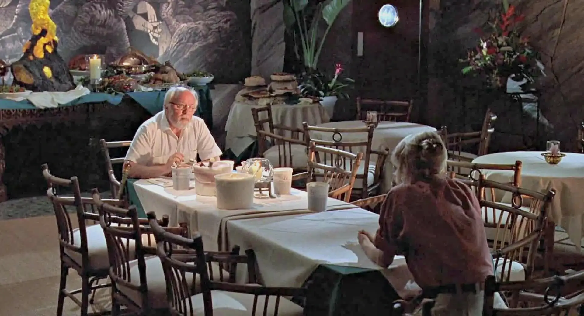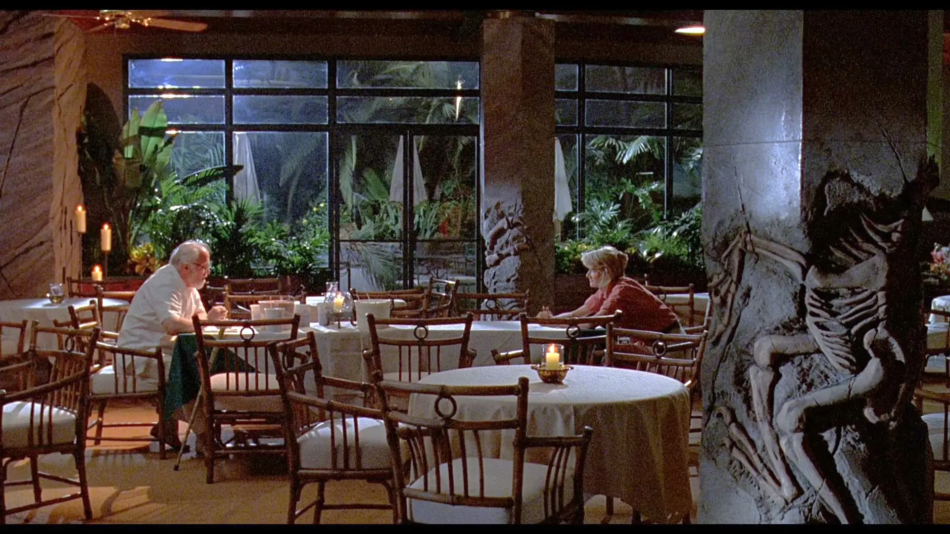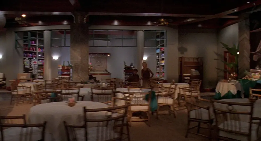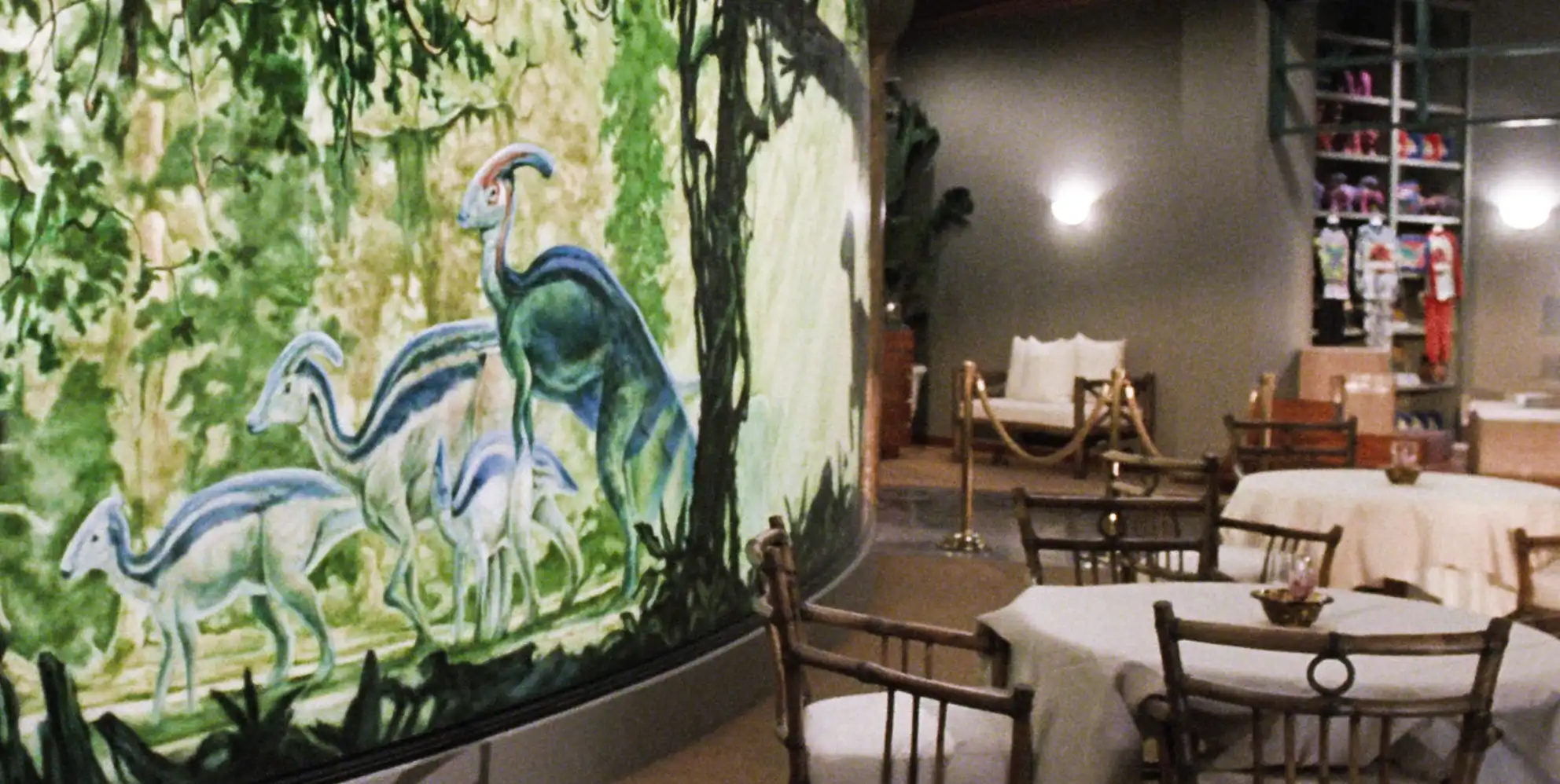 Walking beyond the pairs of wooden double doors that flank the dinosaur mural will lead us into the Jurassic Park dining area, also called the “Cretaceous Café.” This is an expansive room where many important scenes take place in the film.