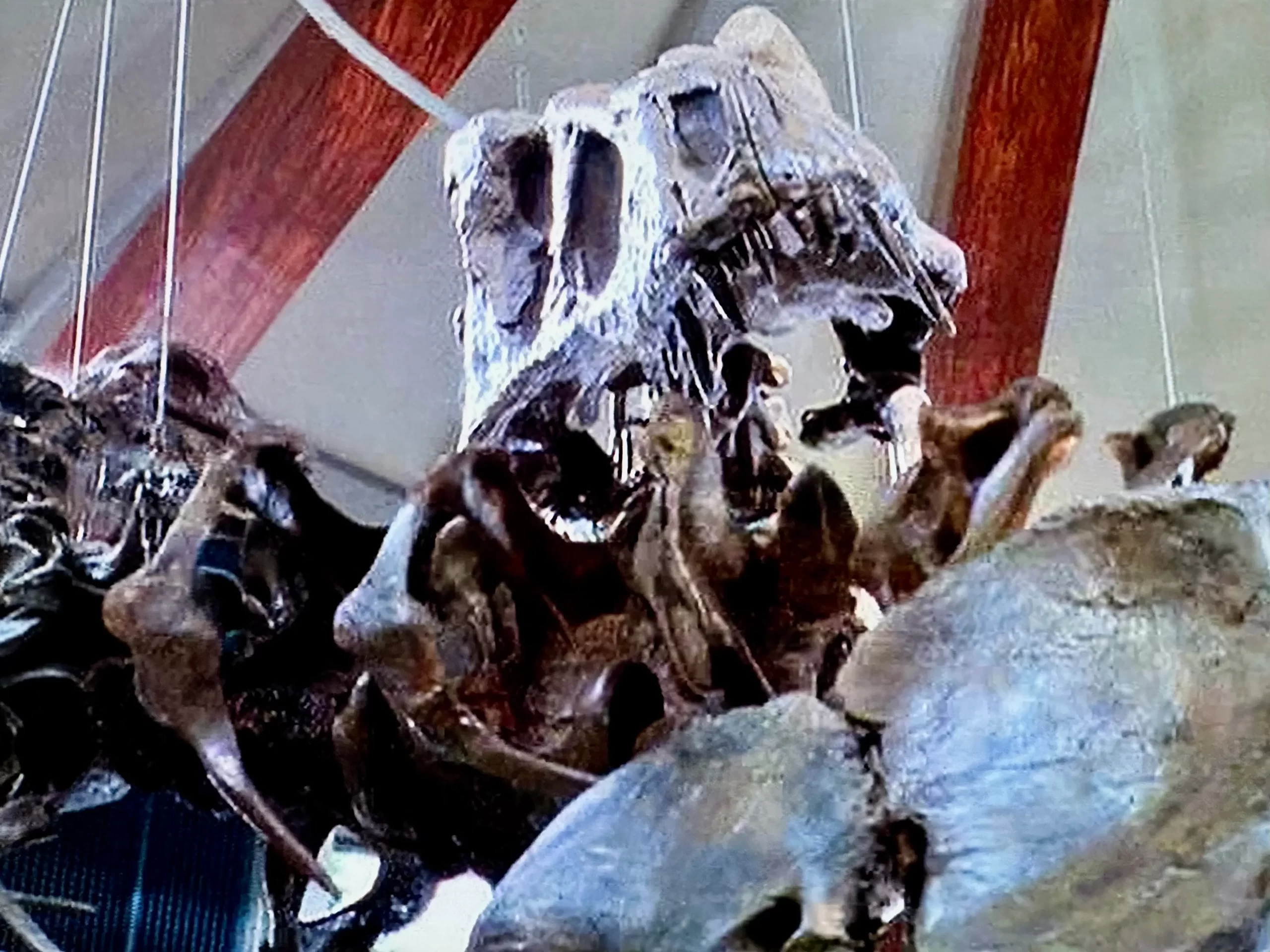 As we step through the imposing double doors, we are immediately filled with awe. A lofty rotunda greets us, adorned with articulated skeletons portraying a Tyrannosaurus rex attacking an Alamosaurus.