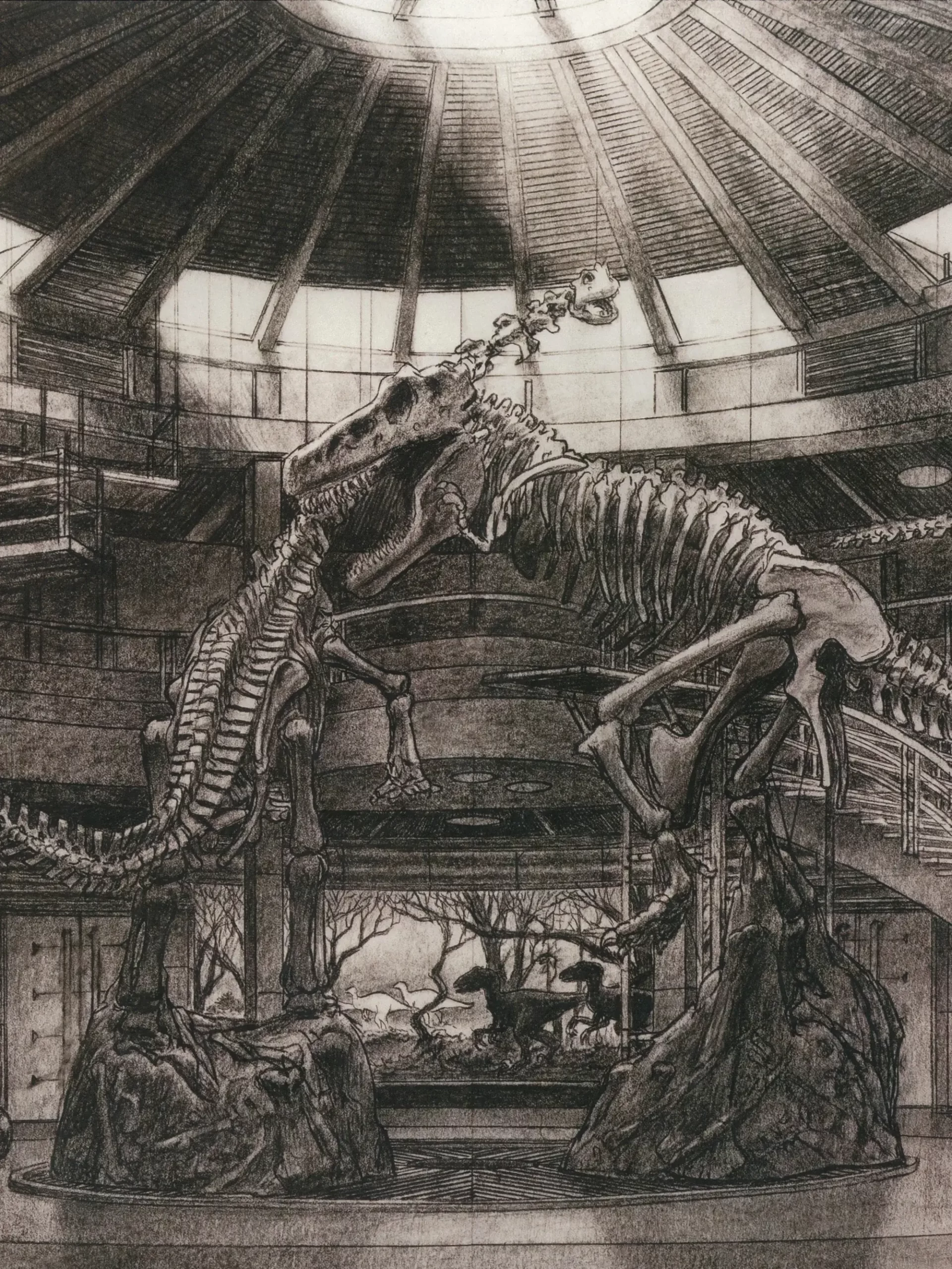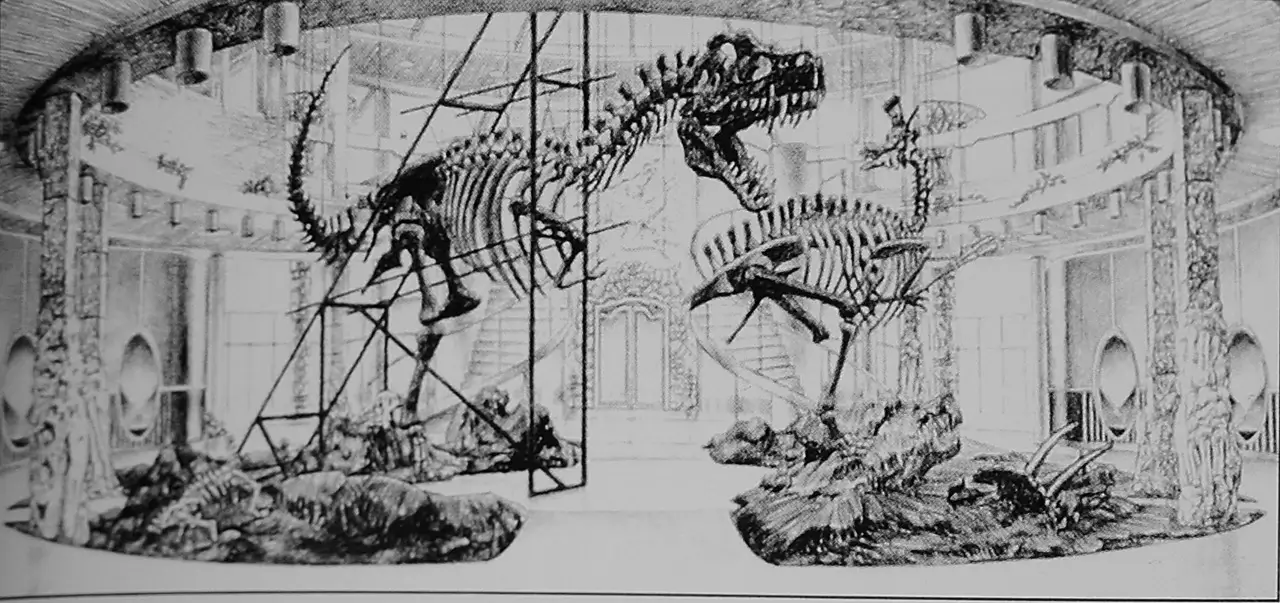 Most importantly, we see stone plinths supporting the articulated skeletons. These appear as raw stone, with only some relief carvings to give the impression of fossils locked in matrix.