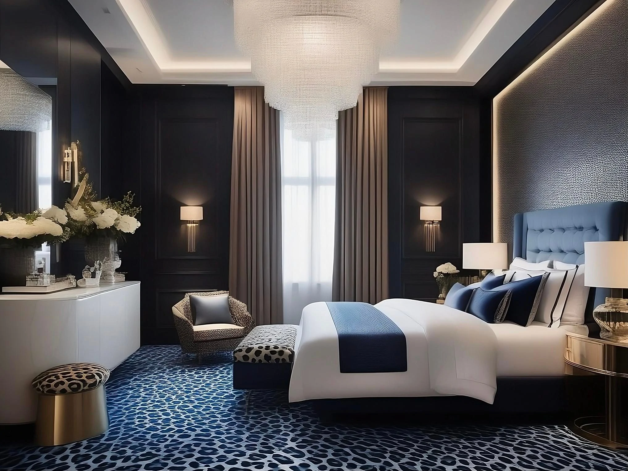 Despite seeming like a loud pattern, leopard print works especially well as a base layer upon which to build an interior room’s design. Below, a blue leopard print fitted carpet serves as a starting point for soothing bedroom done in tranquil deep blues.