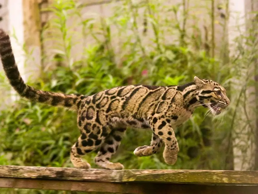 The clouded leopard (Neofelis sp.) is a beautiful, agile animal that inhabits the tropical forests of Southeast Asia. As with snow leopards, clouded leopards are not true leopards and in fact form a sister group to the Panthera. Also, like snow leopards, the coloration of clouded leopards is a tawny grey with black rosettes. The large rosettes of these cats have a nebulous appearance, which gives them their name. Some margins are thick and black, while the other margins tend to fade into grey fog-like clouds.