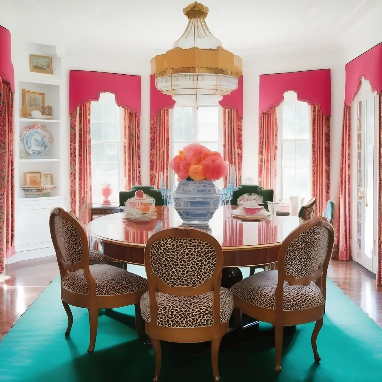 Leopard print also brings a fun, youthful quality to some spaces, such as the bright and colorful dining area below. The colors here are very energizing, as is the more earthy leopard print upholstery on the dining chairs.