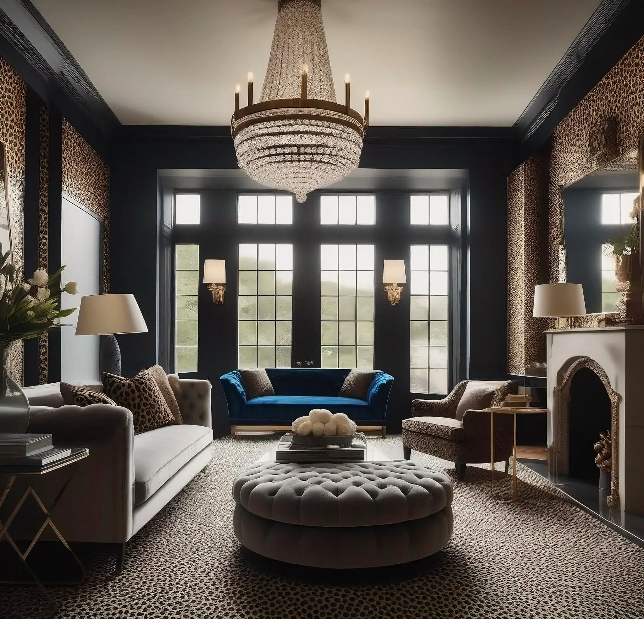 Leopard print can also be applied to walls, either as a wallpaper or fabric, to bring an earthy neutrality as in this living room below. Here, leopard print covers the walls, which are then echoed in some upholstery and a plush cheetah print carpet.
