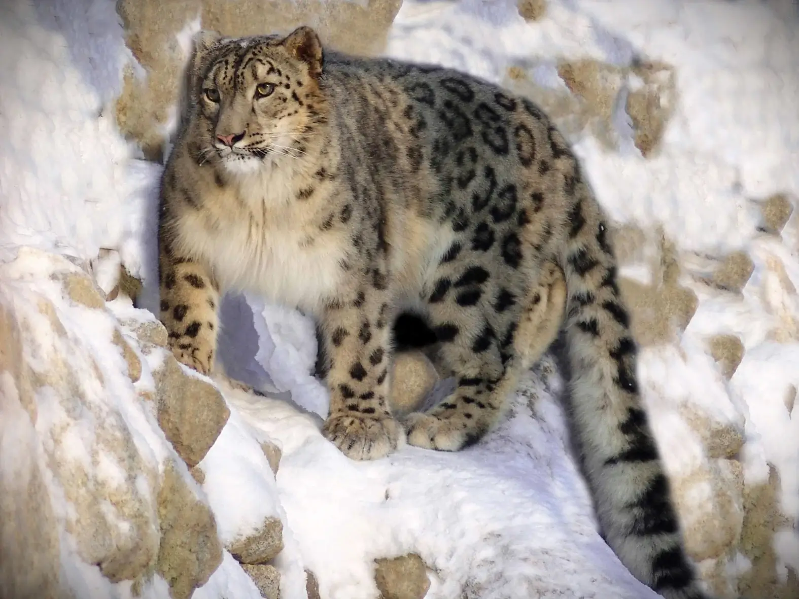 Due to the cold, mountainous habitat in which they reside, snow leopards (Panthera uncia) have much shaggier coats that give their rosettes a less defined and yet more closed appearance compared to leopards. A snow leopard’s rosettes also appear gray and black, as opposed to brown and black for leopards. Despite both being in the same genus and referred to as leopards, snow leopards are not true leopards and are in fact more closely related to the striped tigers!