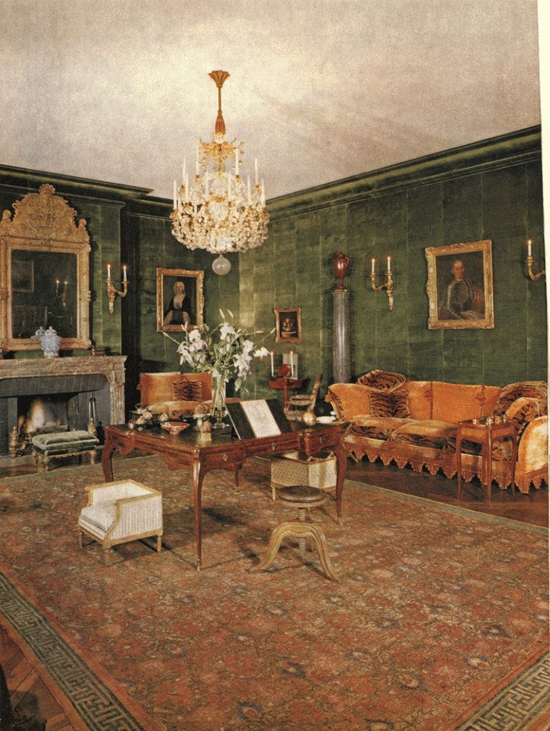 However, the moldings in Burch’s room are white with gold-leaf accents. This is an homage to another famous green room which we will touch on further below.
