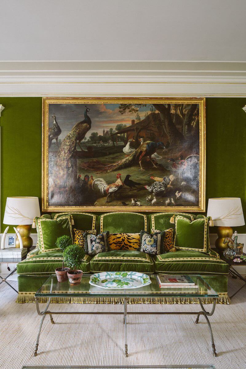Above the sofa hangs an oversized 17th-century Dutch painting of birds by Melchior d’Hondecoeter. I love the play of scale here; it is a masterful design technique. Using select oversized pieces in smaller rooms with lower ceilings actually makes such rooms feel larger.