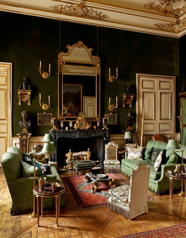 The sofa is particularly interesting because it an almost exact replica of the one that belonged to Hubert de Givenchy at his Hôtel d’Orrouer residence (Speaking of which, Christie’s will be auctioning off some of Givenchy’s furniture and art collection in June). The Hôtel d’Orrouer also featured a salon upholstered in green velvet.