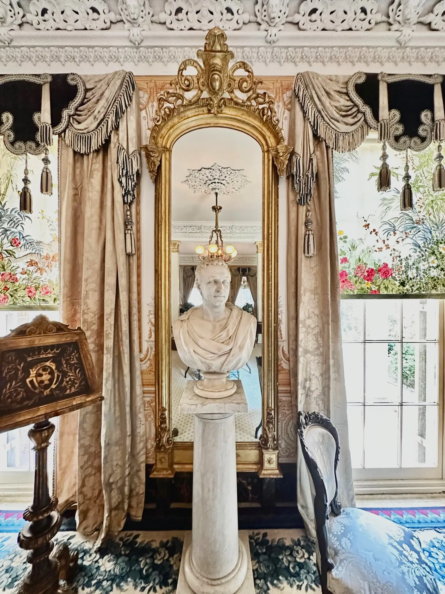 Another Louis Phillipe-style mirror sits on a central pier behind a marble bust. Beside the marble bust sits a music stand from the French Opera house in New Orleans. James Gallier Jr. designed the French Opera house, which burned down in the early 20th century. The music stand is supposedly the only remnant that remains of the opera house today.