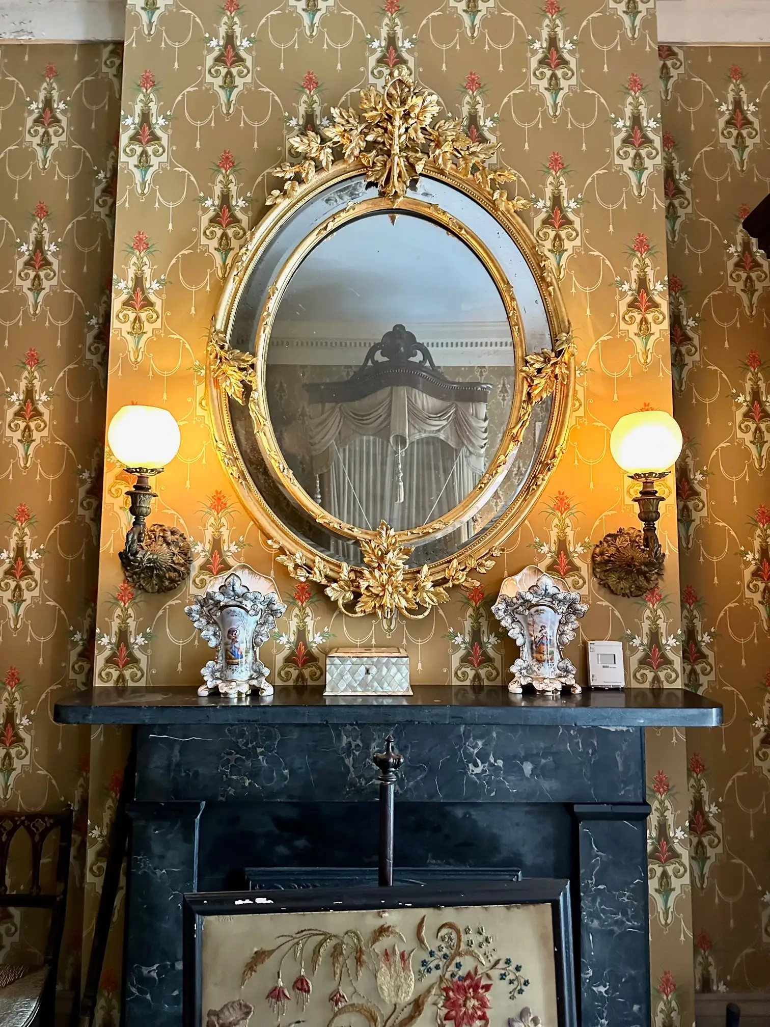Like most formal parlors, the front parlor at the Gallier House is well appointed with period furniture. We can see pieces of Rococo revival furniture, which was extremely popular in the early Victorian era. The Rococo revival hearkens back to the splendors of the Ancien Régime at a time when monarchy was trying to reestablish itself in France. This new Rococo style really started emerging in France under the reign of Louis Phillipe I, the last King of the French.