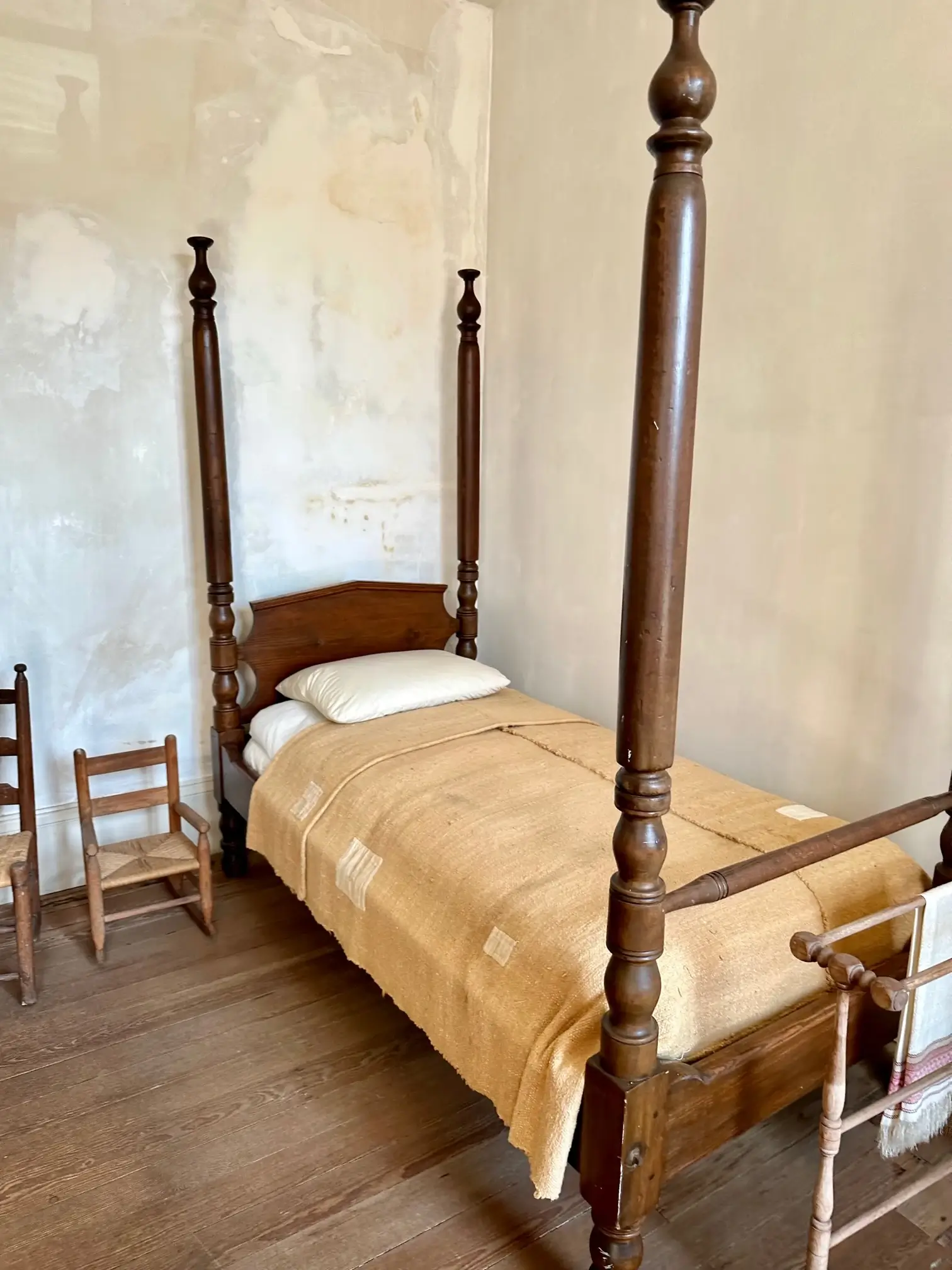 Before the war, the first bedroom would have been occupied by a slave named Laurette, a woman in her 40s. As we can see from the bare walls and sparse furnishings, these were not luxurious accommodations. Especially when we consider the splendors of the main house!