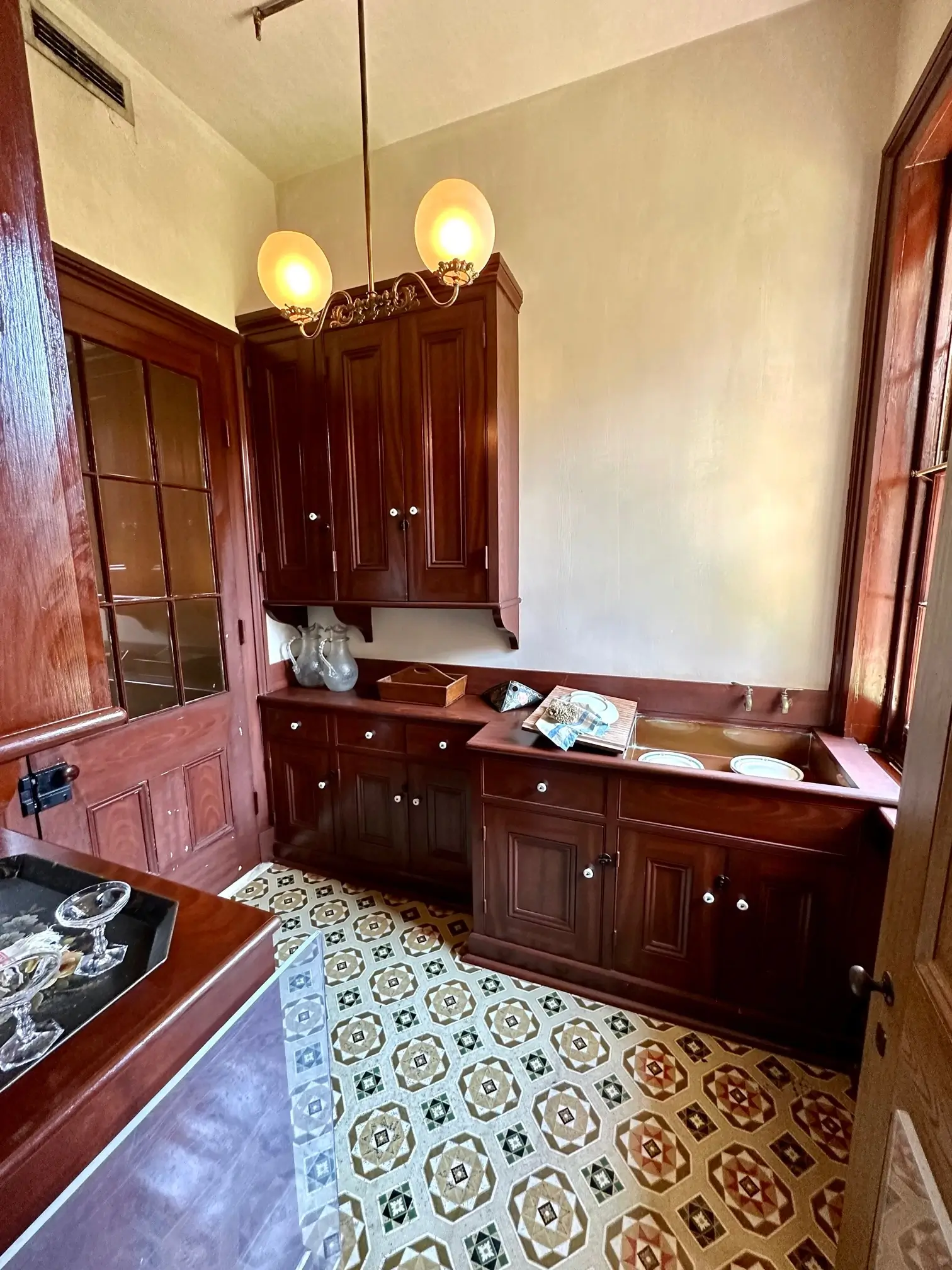 Immediately off from the dining room, we find a small wash pantry. This is likely a storage room for fine china and crystal used to set the table.